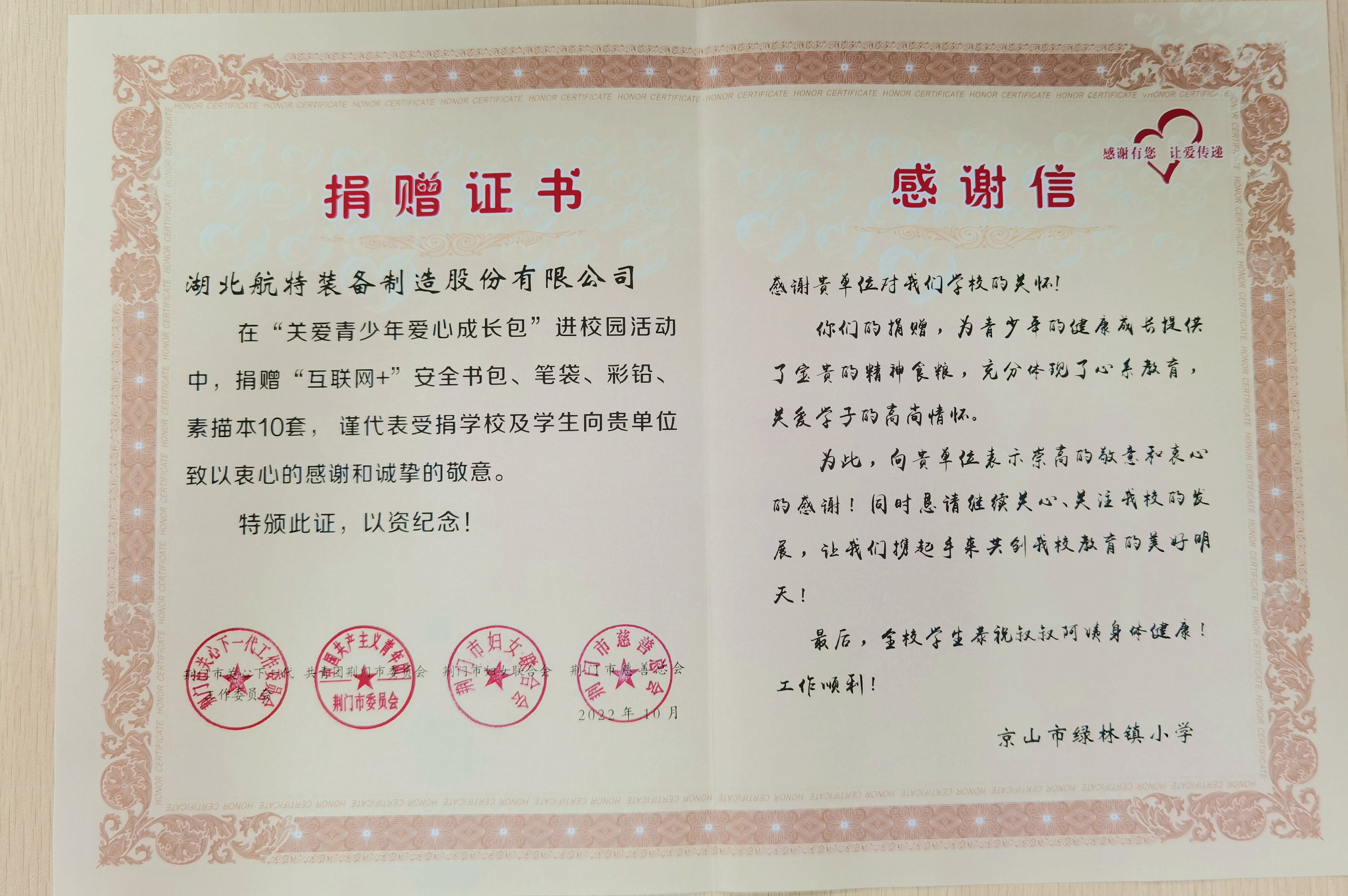 積極支持國家扶貧戰(zhàn)略,相繼為漳河鎮(zhèn)袁沖村、麻城鎮(zhèn)鄧沖村和市健康扶貧醫(yī)療基金捐款25萬元;為京山市綠林小學(xué)捐贈愛心成長包;2020-2022三年疫情期間,在保障員工基本利益的情況下,力保主要客戶供貨,同時(shí)為客戶、社會捐贈愛心款和防疫器材,彰顯航特?fù)?dān)當(dāng)。